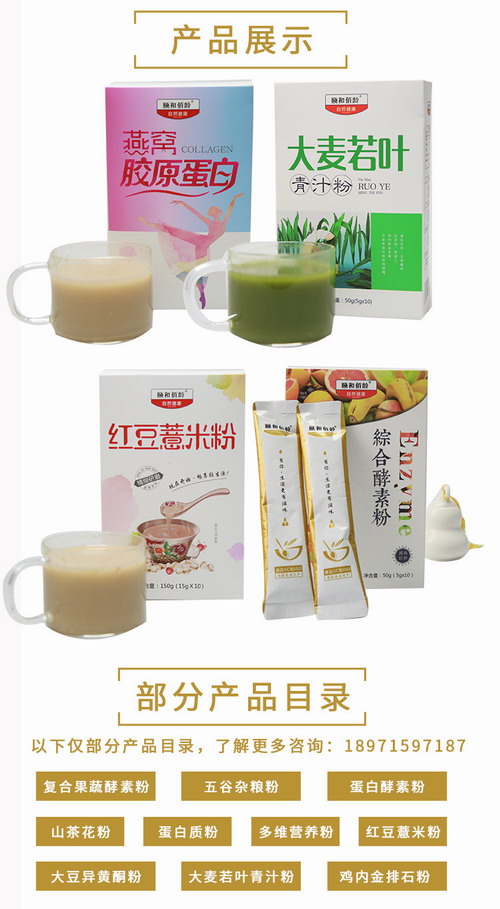 固體飲料熱門(mén)貼牌目錄:果蔬酵素粉,五谷代餐粉,果蔬代餐粉,魔芋代餐粉,代餐奶昔,營(yíng)養(yǎng)代餐粉,膠原蛋白,益生菌,猴頭菇山藥粉,紅豆薏米粉歡迎各位有志之士貼牌加工,種類(lèi)多樣,任君選擇。