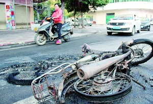 8時(shí)10分,記者趕到事發(fā)現(xiàn)場(chǎng)時(shí),火已經(jīng)被撲滅,只看到路面上倒著一輛兩輪摩托車的殘骸,但不見(jiàn)摩托車司機(jī)的身影。